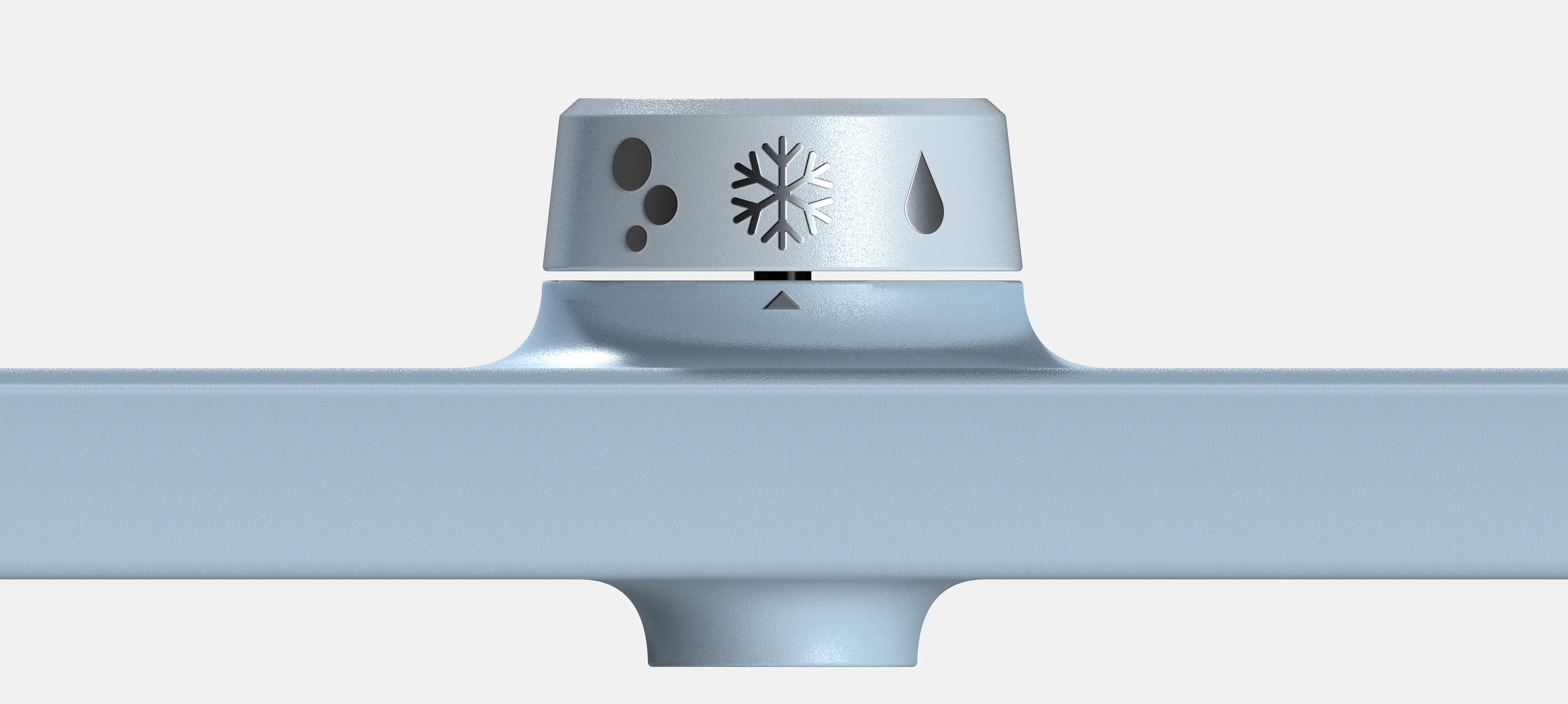 The top module is designed in the shape of a bridge, a parallel with the water flowing beneath it. The surfaces are seamlessly blended to allow for easy cleaning. In the center of the tray, a visual and illuminated circle helps the user position the bottle accurately at the center.